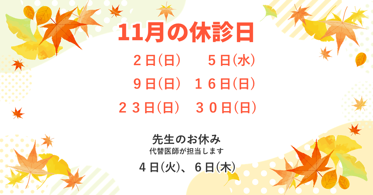 11月の休診日は、11/2(日)、5(水)、9(日)、16(日)、23(日)、30(日)です。